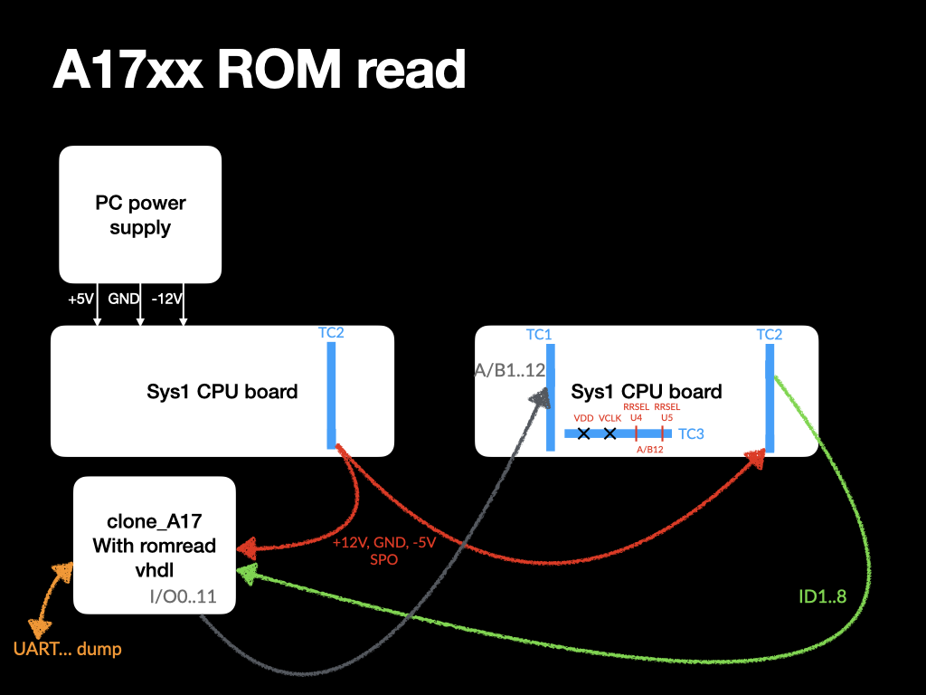 As you can see on the figure above, we use 2 cpu boards. The purpose of the first one is to provide the power supply (+5V, -12V, GND) and reset (SPO) and clock signals (CLK A & CLK /B) to the rest of the system, namely the second cpu board which holds the 2 A17s to be read, and our clone_A17 which will be used to generate the successive addresses for the complete reading of the devices.